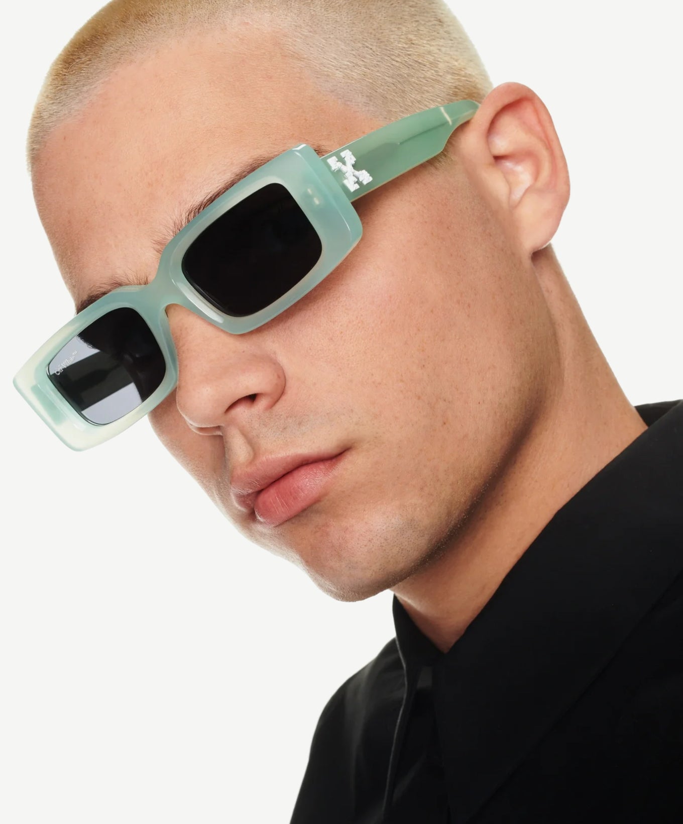 Rectangular acetate sunglasses in light green. Transparent lenses. Off-White™ logo etched on lens and inside the frame. White arrows at hinges.