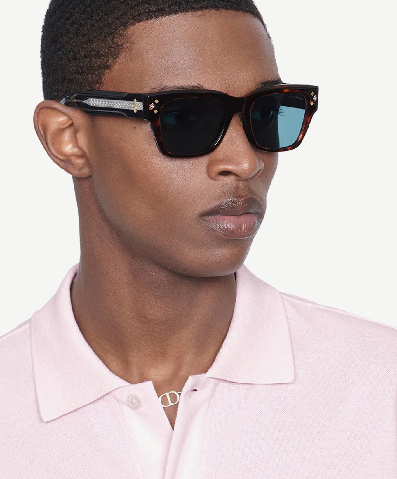 CD Diamond S2I sunglasses offer exceptional style with a contemporary rectangular shape. Black acetate, crystal temples flaunt engraved CD Diamond motif, enhanced by diamond-shaped details for subtle transparency. Gold-finish metal 'CD Diamond' interior hinge adds tailoring-inspired elegance.