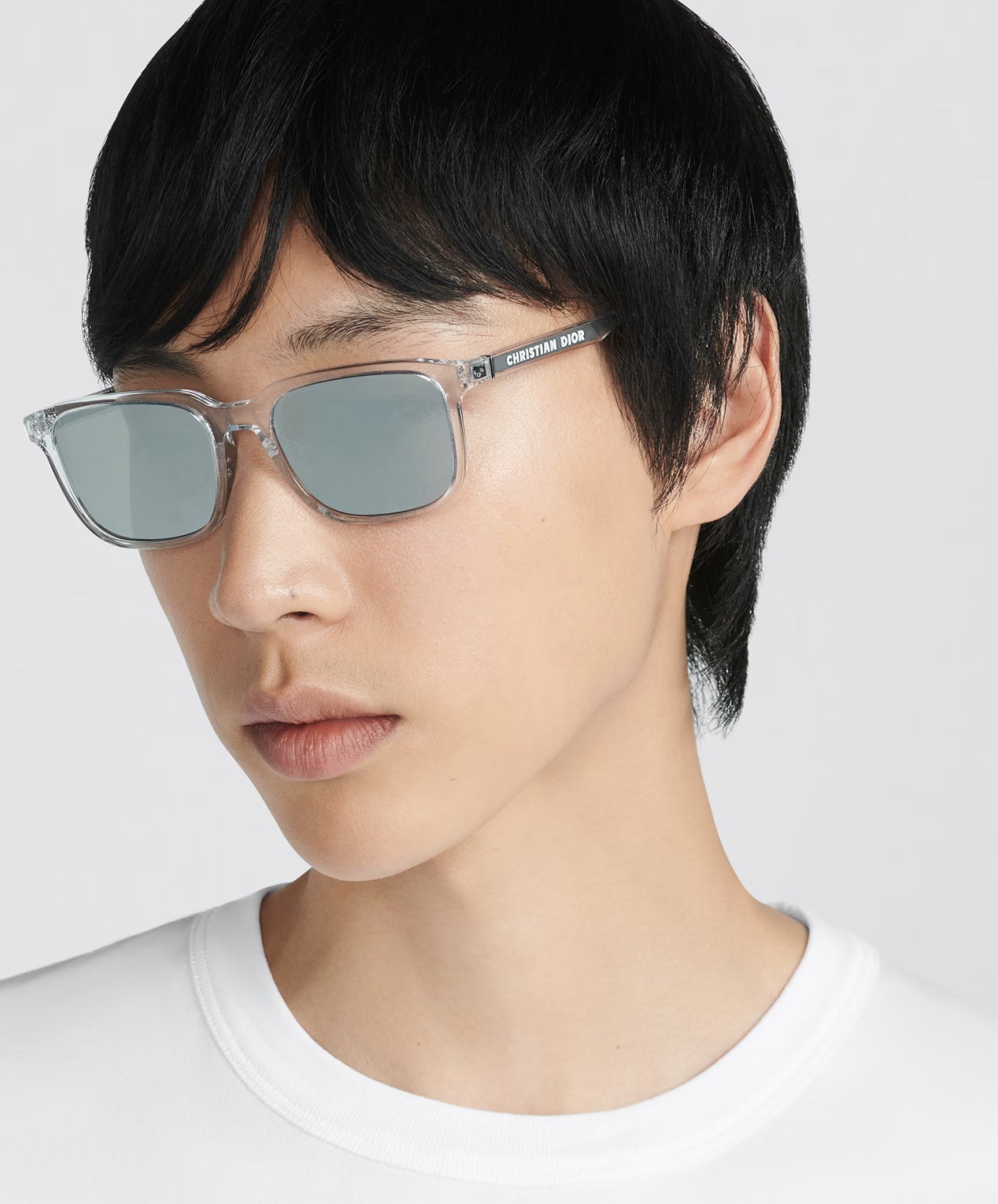 DM40030U-Y sunglasses sport a rectangular shape in crystal-tone acetate, blending sporty charm. Silver metal temples add transparency, 'CD' signature with guilloche detail enhances technical allure. Blue lenses, mirrored Dior Oblique motif, 'CHRISTIAN DIOR' blue technical fabric strap. Perfect match for Beach Capsule creations.