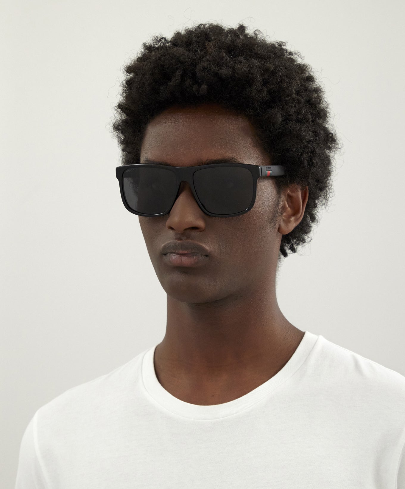 GG0010S sunglasses sport a black acetate frame, rubber co-injected temples. Inspired by Gucci men's accessories, web grosgrain insert adds style. Wayfarer shape, solid grey lenses, wide and high bridge fit for secure comfort. Ideal for oval/round faces.
