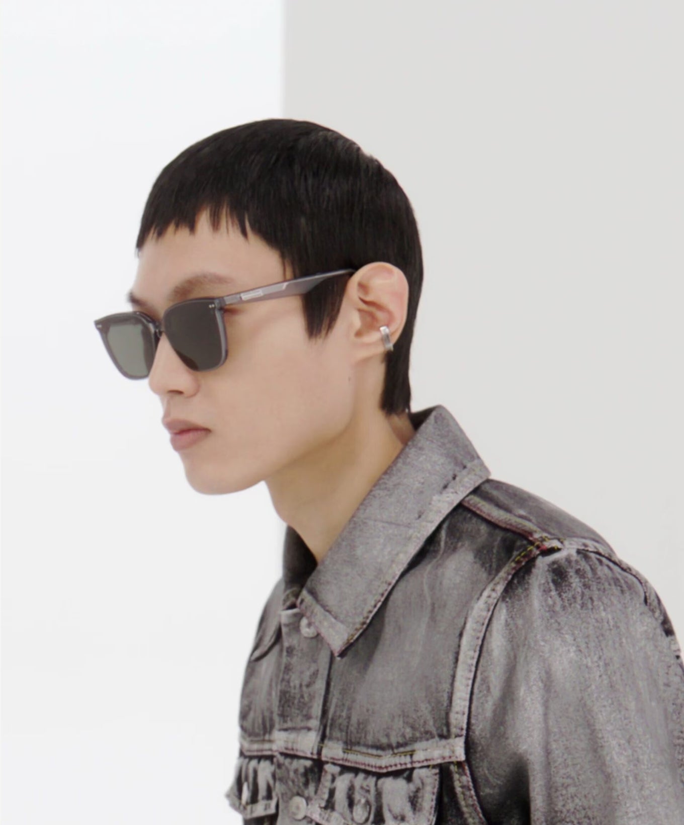 Explore Gentle Monster's 2023 Collection: Heizer 01 sunglasses. A sleek black frame with curved square silhouette, elevated by iconic metal temple detail for sophistication.
