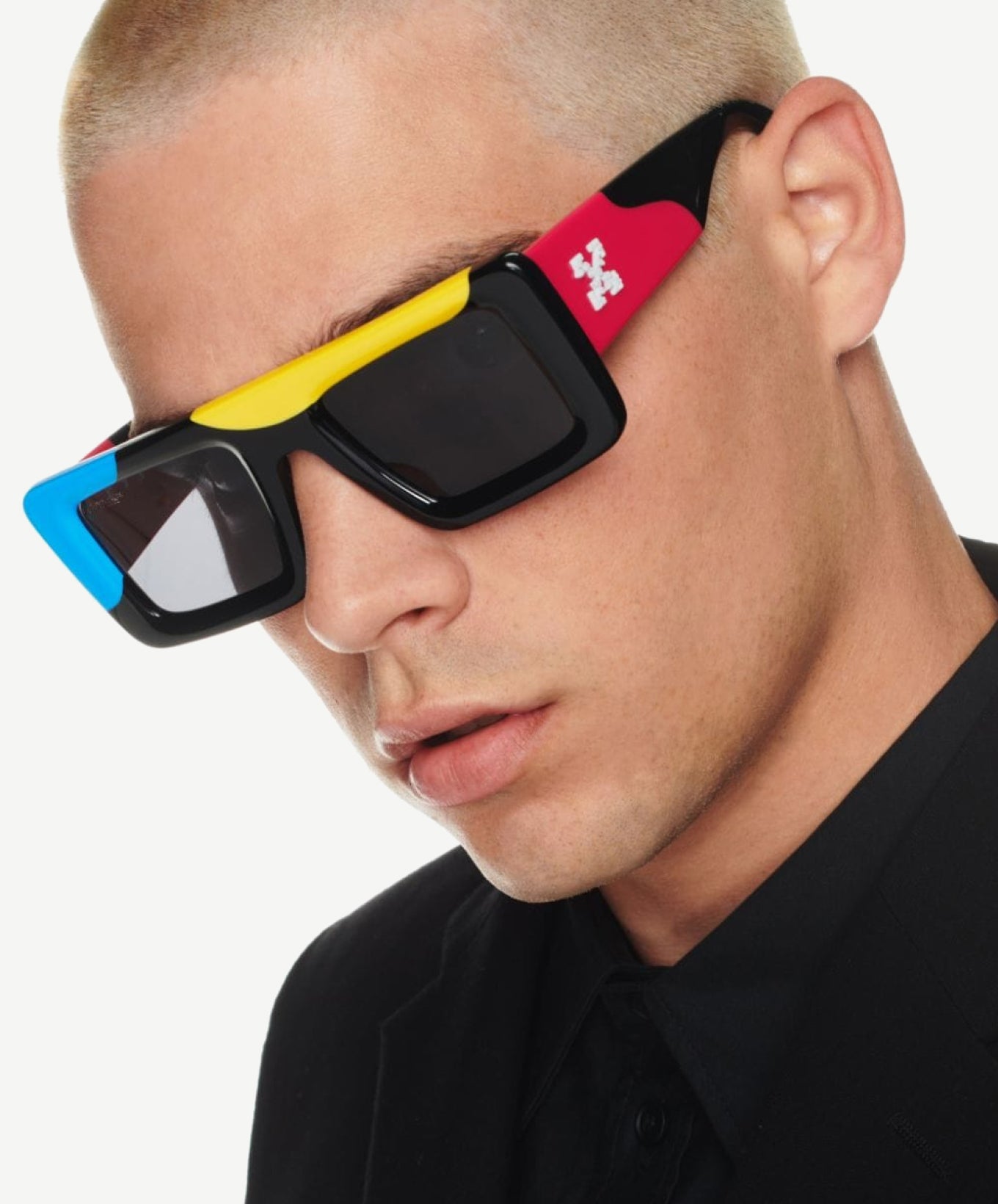 Black base sunglasses featuring white arrows at side. Multicolor rectangular shape and brown lens. Logo engraved on the lens.