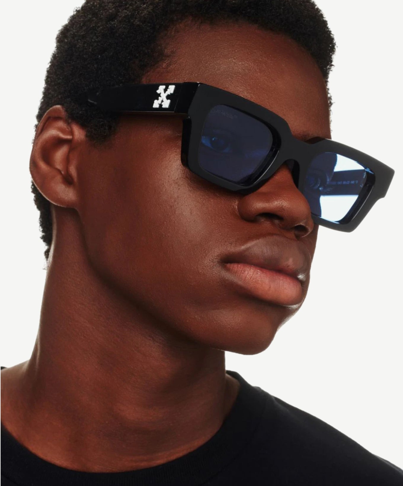 Meet Off-White™️ icons: Virgil sunglasses, embodying architectural lines and modern spirit. Squared black acetate frames, black lenses. Off-White™ logo etched on lens, integrated nose pads. Ultimate embodiment of the brand's essence.